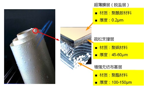 卷式反滲透膜膜片為復合結構,一般由三層組成: