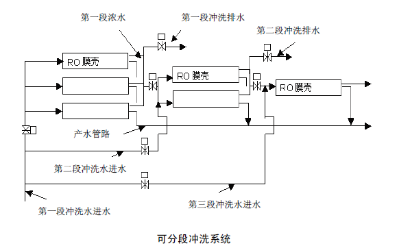 對于多段反滲透系統(tǒng),為了能夠更有效的沖洗膜元件,系統(tǒng)的設計有必要按可以分段沖洗進行設計。反滲透分段沖洗的優(yōu)點有:
